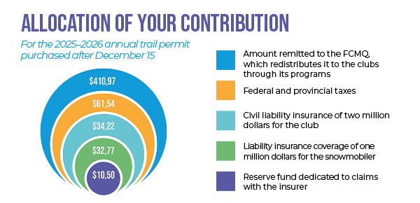 The price of a trail permit includes the cost of the liability insurance, defined as mandatory under article 19 of the Act respecting off-highway vehicles, as well as all applicable taxes.