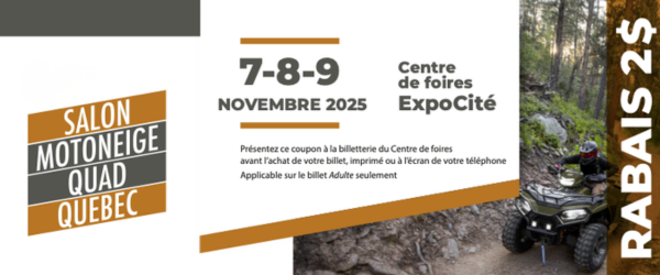 Présentez ce coupon sur votre téléphone et obtenez un rabais de 2 $ sur votre admission au Salon Motoneige Quad Québec 2025.