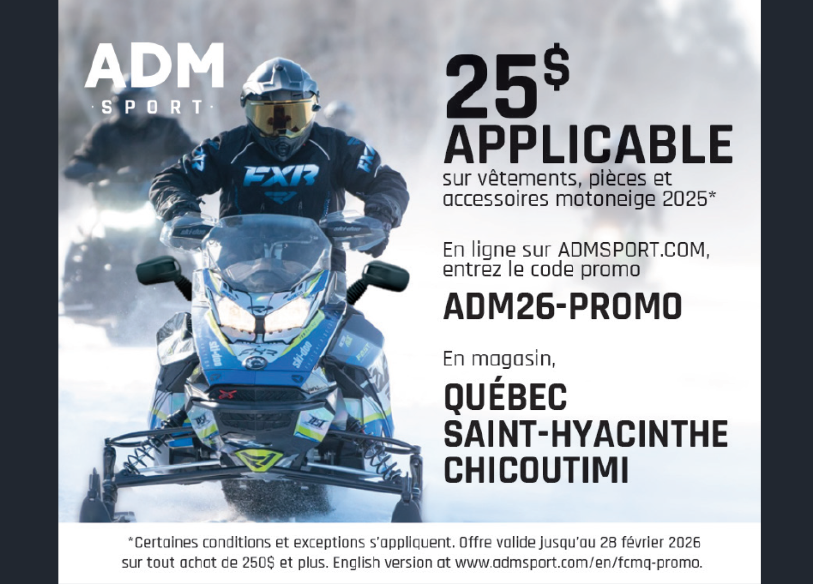 Profitez d’un rabais exclusif de 25 $ applicable sur les vêtements, pièces et accessoires de motoneige 2025 chez ADM Sport. Commandez en ligne au admsport.com avec le code promo ADM26-PROMO, ou rendez-vous directement en magasin dans les succursales de Québec, Saint-Hyacinthe et Chicoutimi. Offre valide jusqu’au 28 février 2026 sur tout achat de 250 $ et plus. Certaines conditions s’appliquent.